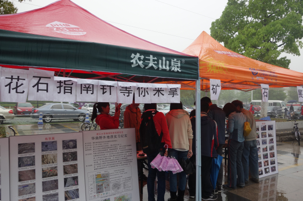 时逢周末,尽管当天下起了蒙蒙细雨,但同学们对矿石化石的好奇和求知的热情依旧不减。活动现场引来众多同学参观。晶莹剔透的水晶、具有“吸磁”魔力的磁铁矿、黄澄澄的碧玉以及痕迹清晰的各式化石等,让同学们不禁俯下身来仔细观赏,赞叹不已。沈老师是地球科学系地质专业同学们的启蒙老师,具有丰富的矿石研究经验,他亲切耐心地为每一位同学解答疑惑,讲解各个石头背后的故事——岩性、成岩过程、产地等等,极大地丰富了同学们的知识,激起了同学们对矿石和地质专业的兴趣。此外,图文并茂的地质考察展板、精美的雨花石纪念品,也为这次活动增色不少。