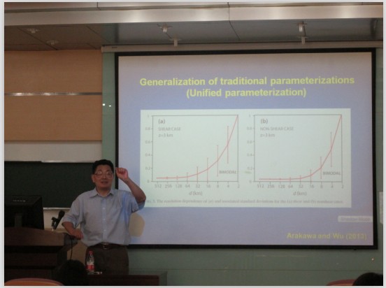 吴教授的报告分为四个部分。首先吴教授讲到,作为全球水汽和能量循环的重要部分,云和降水过程在气候模式中起着非常重要的作用。气候模式中对于对流和云等的描述是获得降水特征准确模拟结果的关键因素,而云模式是获得云和辐射等过程特征的一个重要方法。接着,吴小青教授向我们介绍了云模拟系统的发展现状。为了在气候模式中加入云过程的描述,有两种方法。一种是增加模式的分辨率,或在气候模式的每个网格上用云模式替代参数化(即超级参数化);另一种是改进传统的对流参数化方案。在报告中,吴教授通过对美国夏季降水以及MJO等个例的模拟结果分析说明模式的分辨率提高到一定程度后,并不能继续明显的改善模拟效果。而通过改进对流参数化方案中的闭合条件、触发条件等也可以很好的改善模拟效果。许多气候模式中存在“云和辐射不一致”的问题,吴教授等在参数化方案中考虑了次网格尺度中云对辐射的影响,加入了MOS方法,使模拟结果得到了很大的改善,与实况非常接近。在第四部分中,吴小青教授向在座师生介绍了利用更多的观测资料进行的相关工作。最后,吴小青教授总结到:虽然计算机性能的提高使气候模式的分辨率得到显著的改善,但是次网格尺度物理过程的参数化仍然是很有必要的;利用高分辨率的模式进行模拟的同时也需要高分辨率的观测资料进行验证,而高分辨率观测资料的获得是有一定困难的;对于云分辨率模式模拟结果的统计和诊断分析有助于进一步理解和改善气候模式中云过程的参数化。