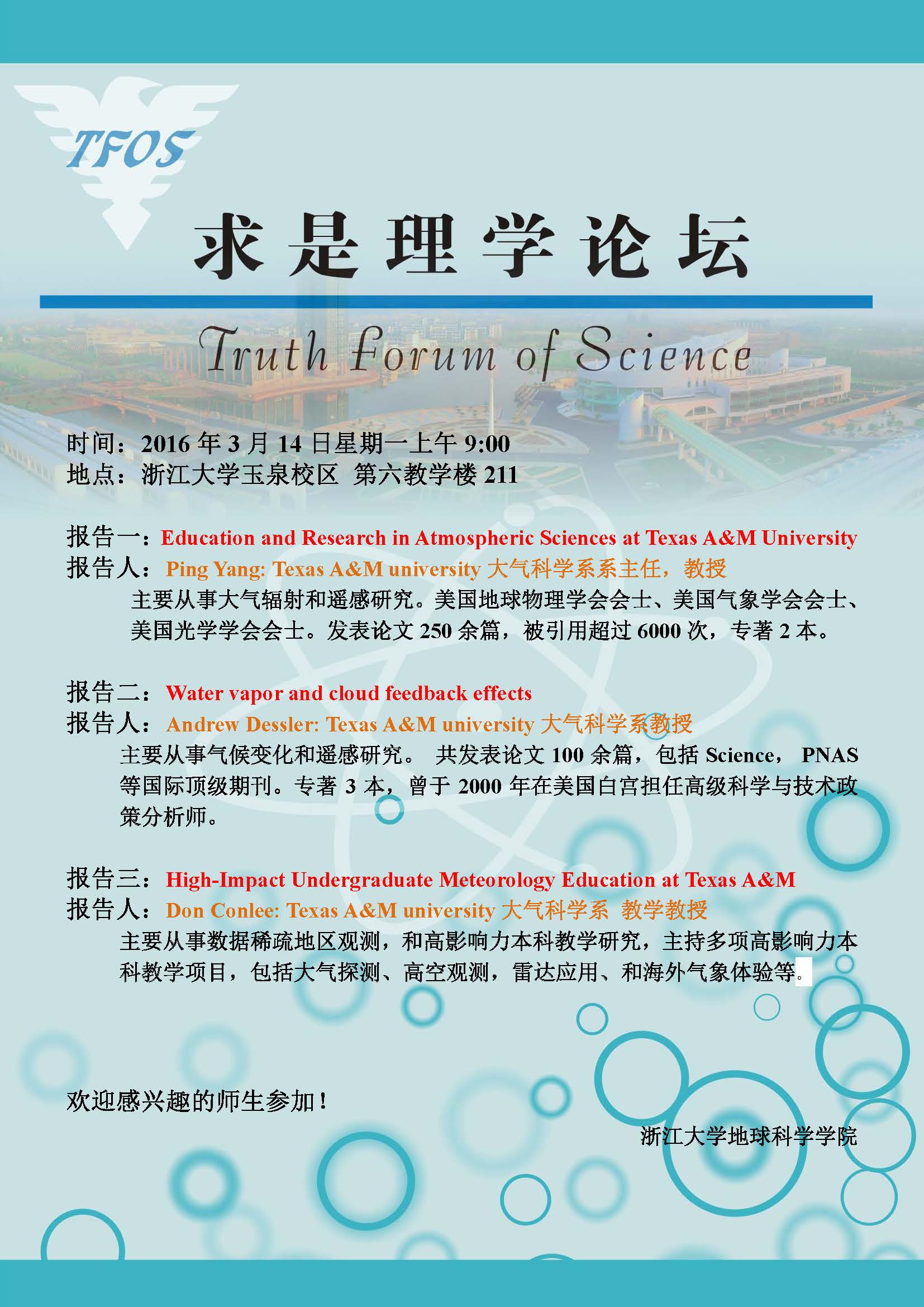 求是理学论坛――Department of Atmospheric Sciences, Texas A&M University 三位教授学术报告通知