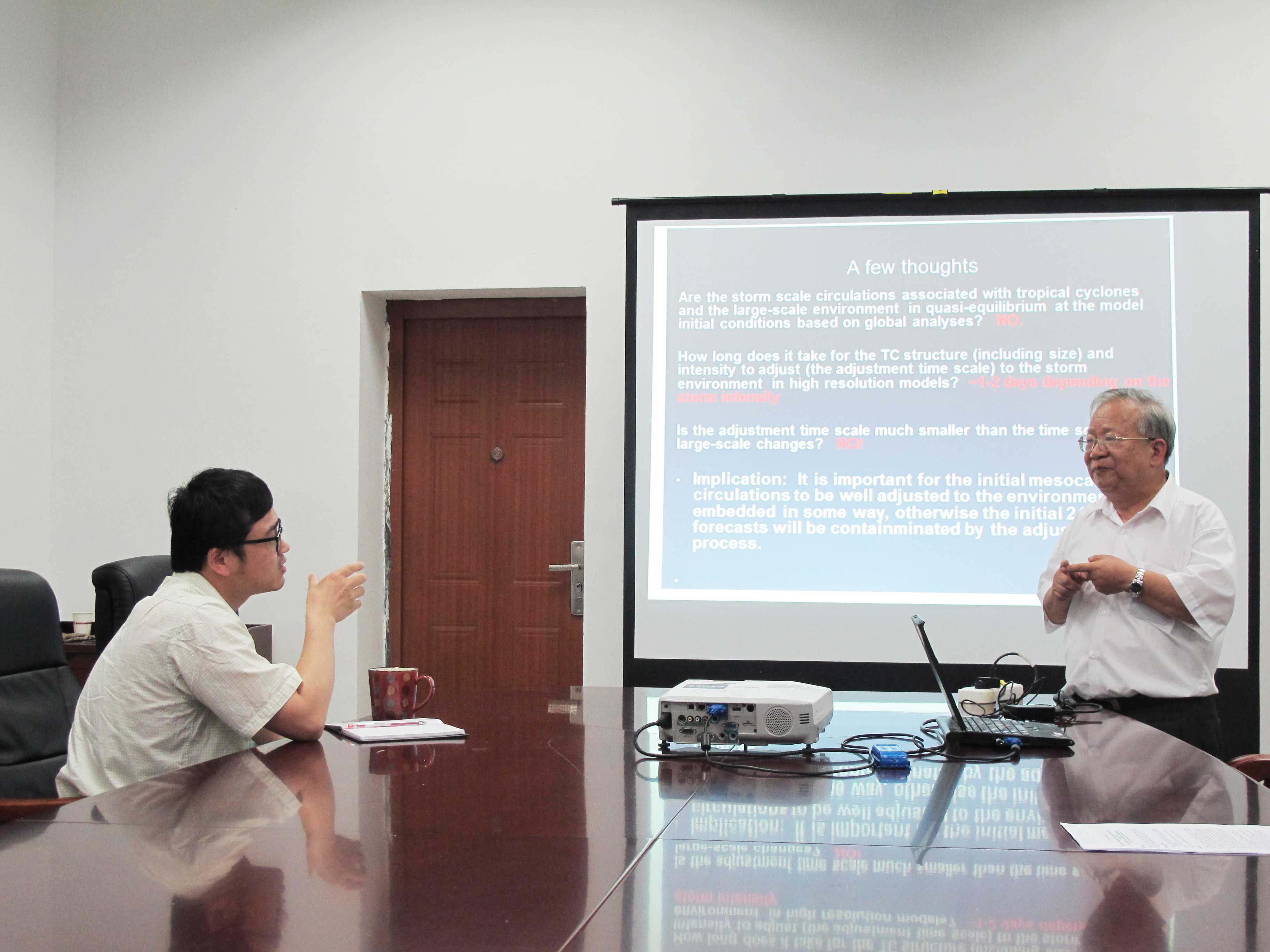 报告一开始,陈教授围绕主题首先介绍了一种新的热带气旋初始化方案(NC2011),该方案由他的研究团队于2011年提出来并发表在美国《每月天气评论》上。NC2011初始化方案是指在热带气旋的结构、强度与模式环境场有密切关系的假设下,先对模式进行小时积分(dt=1h),然后将t0+dt时刻的气旋结构数据返回去作为初始值再进行小时积分,如此循环积分后,热带气旋在初始时刻就会与模式环境场调整的非常匹配,用他的话讲就是确保模式在“起跑点”就是对的。接下来,陈教授向我们展示了采用NC2011初始化方案对台风个例的模拟,在9字型、6字型和双眼墙型等18个西北太平洋台风个例的研究中, NC2011初始化方案对台风的垂直结构、强度和路径等都能做出很好地模拟与预报。为了减少初始化方案循环积分时间,以便较好地应用于实际业务,陈教授对NC2011方案进行了改进,得到了NC2014方案。无论对于强台风还是弱的热带气旋,与美国环境预报中心HWRF(2012)模式和美国海军COAMPS-TC(2012)模式相对,采用NC2014初始化方案对台风路径、最大风速、最低气压的预报都更具优势。最后,陈教授认真总结了报告内容,并从NC2014初始化方案将应用于台风整个生命期的模拟研究、需要更多的个例检验、加强数据同化提供更好的环境场等方面做了工作展望。
