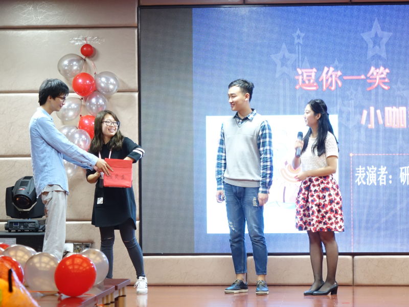 晚会内容由节目和游戏穿插进行。伟德国际victor1946官网DFM街舞社带来的爵士舞激情热辣;刘�和高倩同学带来的吉他伴唱别有味道,刘�更是在大家的欢呼声中即兴自弹自唱一首;熊一璇和王庭刚同学带来的对唱深情款款;研博会同学们带来了重磅“笑弹”——小咖秀,大家卖力的搞笑模仿引得台下的同学们笑声不断,将晚会推向了高潮。游戏环节同样精彩连连,才艺大比拼、借物游戏、抢凳子和团队大协作,游戏形式多样,花样繁多。同学们积极参与游戏,轻松诙谐,优胜和参赛的同学们分别拿到了秋冬温暖的抱枕和签字笔。