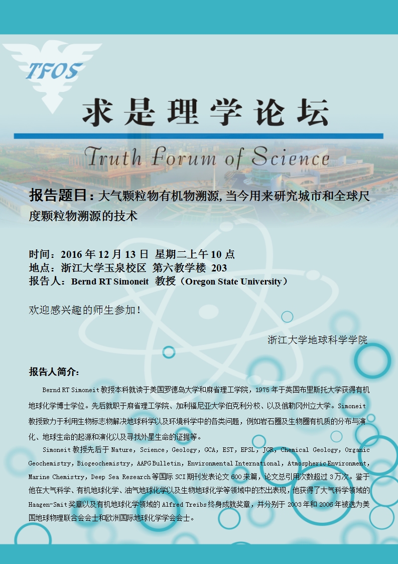 求是理学论坛――美国俄勒冈州立大学Bernd RT Simoneit教授学术报告通知
