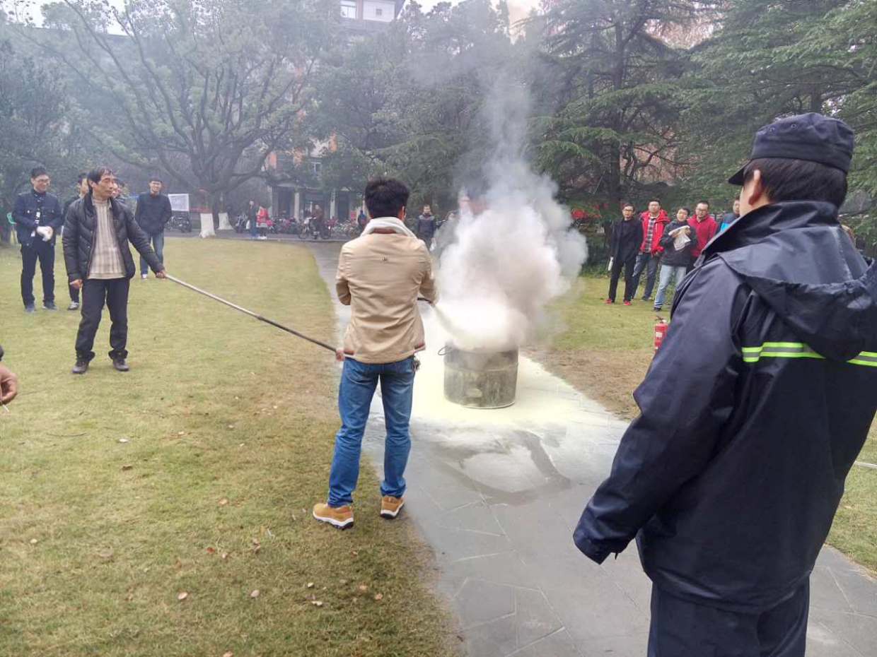 随后大家回到各自的实验室,随着火灾报警铃声响起,开始了正式的消防演习。师生们用毛巾捂住嘴和鼻,紧张而有序地从楼中撤离,最后大家安全到达露天平地。在这里,保卫处的老师又给大家讲解了火灾现场扑救的要领,演示了灭火器的正确使用方法。师生们纷纷拿起灭火器,进行了实战演练。