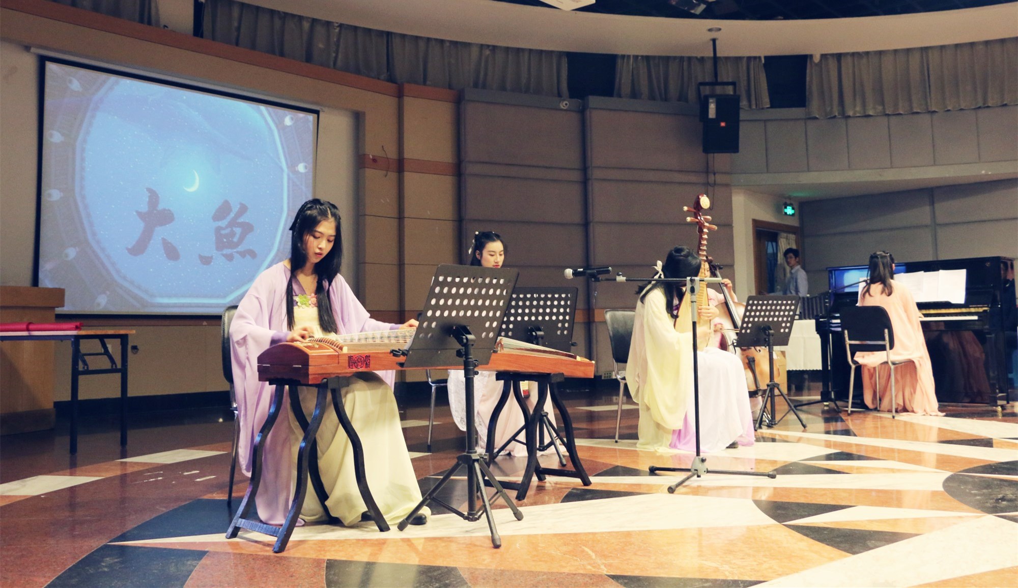 身着古装的地科五朵金花范小雨,黄晓琳,姜雨岐,杨许莹,余佳鸣,弹奏了一曲充满古风与美感的《大鱼》,悠扬的乐曲让人感到心灵平静,身心舒缓。