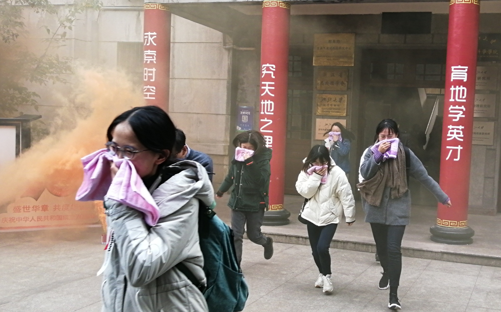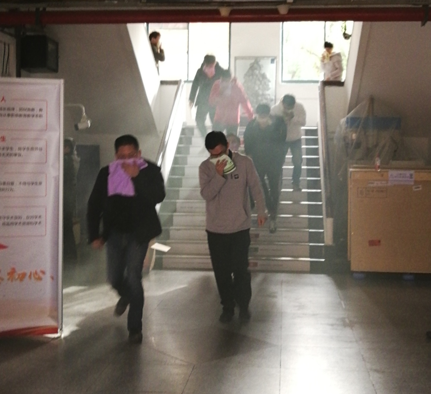 消防紧急疏散环节,伴随着刺耳的警报声,教六楼内师生用湿毛巾捂住口鼻,弓身穿过模拟烟雾,快速有序撤离至安全地点。