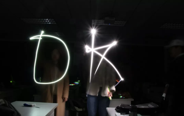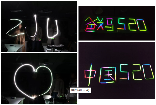 团学联成员借助手机、荧光棒和长时间曝光技术绘出所思所想,其中,部长团和主席团为每个团学联成员绘出名字,成员借此机会向祖国、父母、学校表达了深深的爱意。