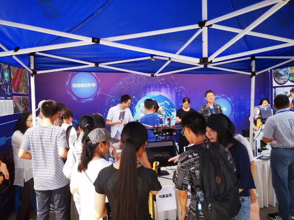 伟德国际victor1946官网精心设计了介绍地质学、地理信息科学和大气科学三个专业的展位喷绘背景,蓝色的旋转地球尤其吸睛。地质学专业通过电子显微镜展示了矿物和岩石的精彩世界,地理信息科学展示了大型无人机及其采集的三维数据和处理成果,大气科学专业先进的大气测量仪器也吸引了很多同学。