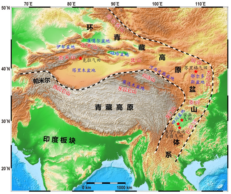 图2 环青藏高原盆山体系内主要造山带、盆地和大气田(据Chen et al., 2019)