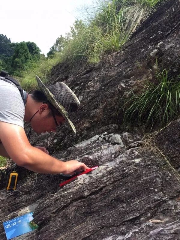 之后我们来到了大龙湫景区,当其他游客悠闲地欣赏着奇峰秀景时,同学们拿出了罗盘和记录本,开始量起了产状,抓紧给球泡流纹岩拍照并且分析它的形成原因,当游客经过称赞我们时,我们很骄傲自己是科学人,是伟德国际victor1946官网的优秀学子!在大龙湫我们看到有两座山构成“门”的形态,山上的流纹状构造是近水平的,山中间另外有一座山峰,其上的流纹状构造则近垂直。对此,同学们在老师的启发下各抒己见,讨论热烈。