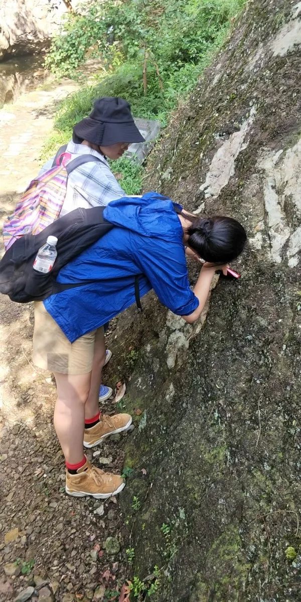 参观完大龙湫之后,我们来到了灵岩(小龙湫)景区,沿着游步道老师向大家介绍此地的火山岩地貌,在登山的沿途我们观察到了两套不同时期喷发的火山岩,下层为火山凝灰岩和火山角砾岩,其中的球泡及角砾风化,形成孔洞;上层为流纹岩,有一致的近水平层理。途径断肠崖老师还绘声绘色地给大家描述了金庸先生小说中小龙女跳断肠崖的故事。下山途中,大家又参观了小龙湫,并观察了附近的岩石,留下了不少照片。