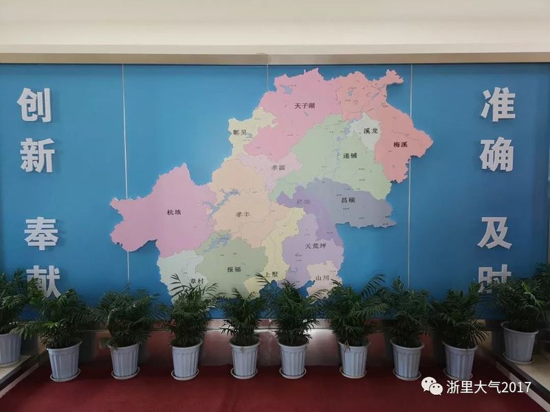 随后,我们来到安吉县气象台。与杭州市气象局一样,气象台的入口处也有“准确、及时、创新、奉献”四个词。由于我们参观的当天正好是台风“安比”即将登陆之时,气象台内的工作人员都在加班,密切注视着台风的移动路径和县内的气象状况。当天还有安吉县电视台的记者来向台长采访有关台风过境的信息。