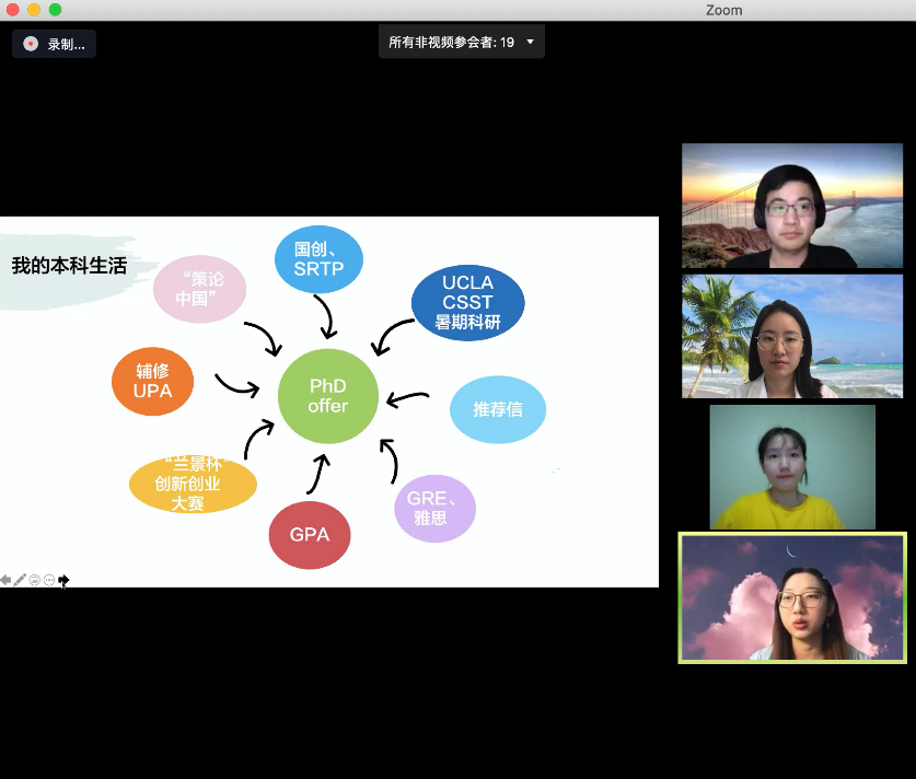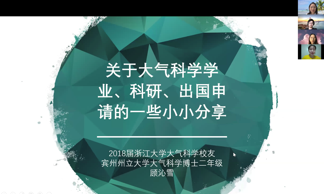 5月10日上午,伟德国际victor1946官网在zoom平台组织开展了海外校友线上分享会(大气专场)。分享会邀请了2018届大气科学系校友、宾夕法尼亚州立大学博士生顾沁雪,2018届大气科学系校友、加州大学洛杉矶分校博士生沈佳琪,2019届大气科学系校友、斯坦福卡耐基研究所博士后段磊分享留学申请经验、留学生活以及海外科研经历。副院长曹龙、大气科学系主任李卫军、外事秘书邵丹蕾以及20余名大气科学专业本科生参加了分享会。