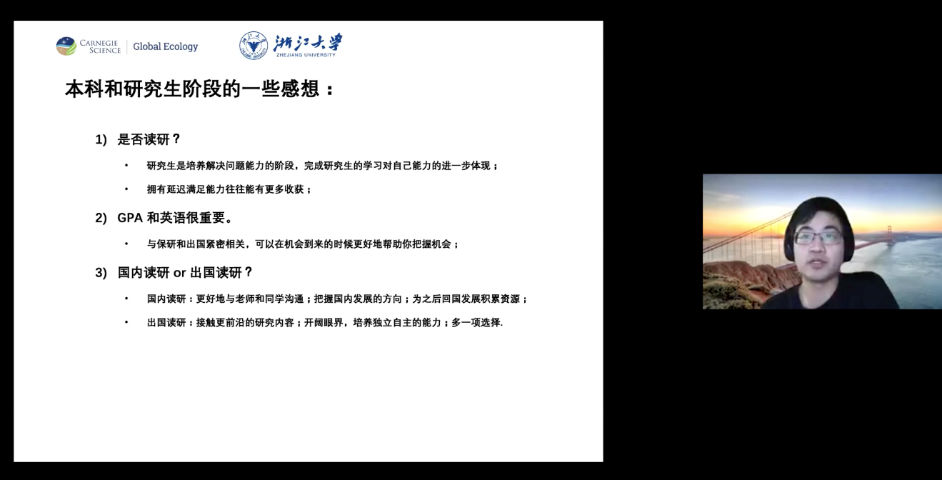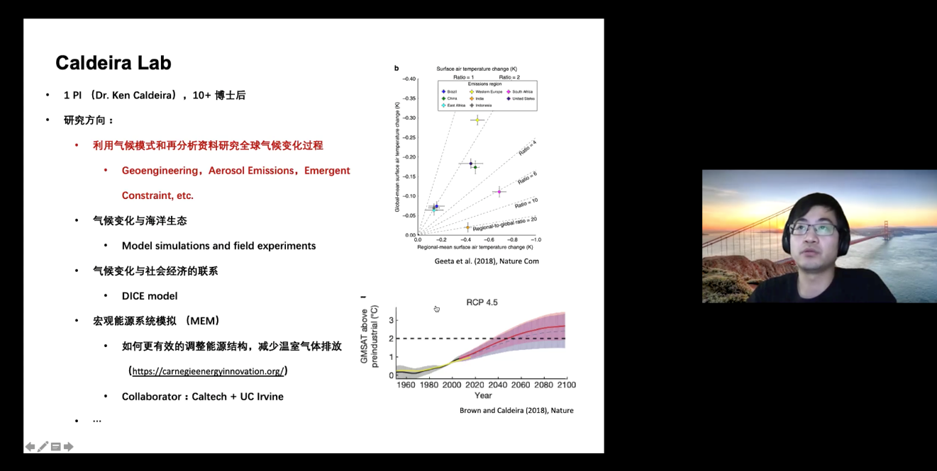 段磊介绍了卡耐基研究所的基本情况,回顾了浙大的学习经历,对比了博士后与研究生的区别等。段磊所在的Caldeira Lab主要由首席研究员(PI)和博士后组成,研究方向包括全球气候变化过程、气候变化与海洋生态、气候变化经济学、宏观能源系统模拟(MEM)。