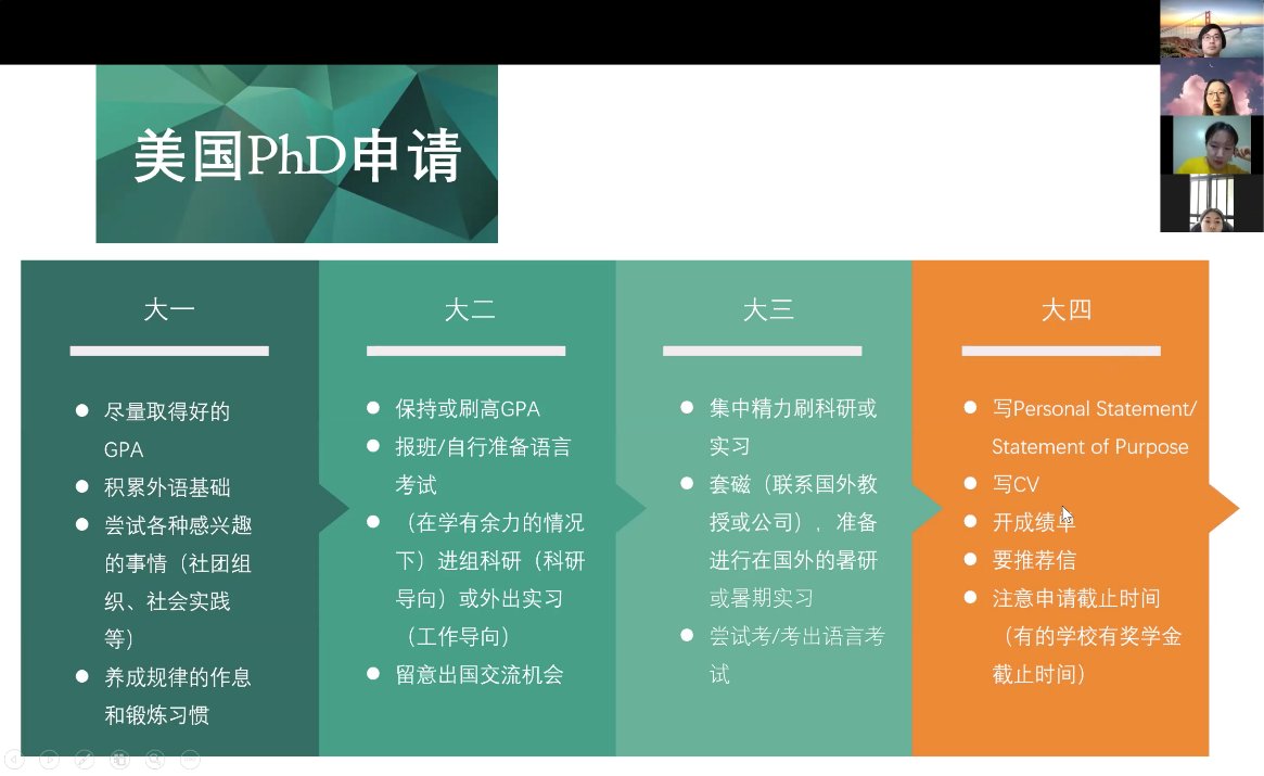 最后顾沁雪介绍了出国深造的理想时间表,给希望出国留学但不知如何规划的同学们提供了参考:大一期间,打好外语基础,少而精地参加社团和社会实践,养成规律作息和经常锻炼的习惯;大二专注提高GPA并开始准备语言考试,学有余力情况下进课题组参与科研或实习,同时留意出国交流的机会;大三参加语言考试,联系海外导师寻求暑假海外科研实习的机会;大四开始申请学校,准备推荐信,完善个人陈述和简历等。