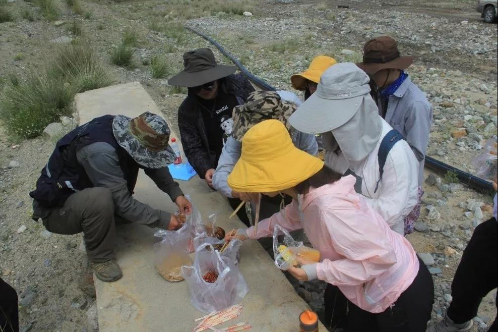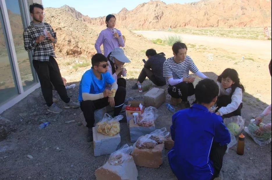 进入红柳峡地区之后,第一天老师就带领我们走了十多公里,仔细观察每个点的产状,直到太阳下山。这是我第一次在野外工作那么长时间,震惊中对地质工作者的敬佩油然而生。每天近十个小时的野外工作强度常常令我们感到疲惫,但每天的午餐时间却非常愉快。尽管手里的是馒头榨菜,但配上诱人的卤味,和有趣的人一起,就是另一番滋味了。我逐渐体会到,野外才是更大的教室,大自然才是更好的学校。