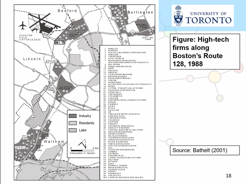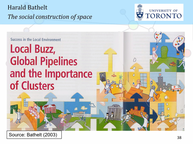 Bathelt教授重点介绍了地方传言和全球性通道在以知识为基础的集群发展中发挥的作用。在此基础上,他进一步介绍了全球集群网络及其存在的空间差异特征。比如跨国公司在制定企业策略时通常是以成本/资源为导向的或以创新/知识为导向的,这就决定了这些跨国公司更倾向于选择作为创新/知识密集型企业中心的产业集群,而不是非产业集群。