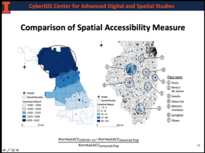 接下来,Shaowen Wang教授展示了将疫情数据应用到实际场景中的例子。他与团队将伊利诺伊州的疫情分布情况、各地的人口分布、各医院和医疗点的分布以及路网数据进行叠加展示,并利用特定的模型进行分析以推测疫情之下医院的负荷能力,为决策者提供决策基础。