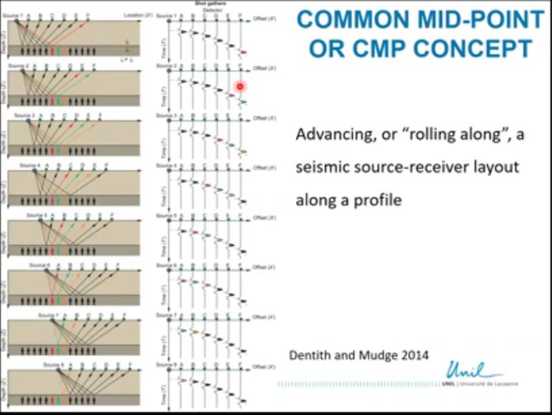 大陆下地壳的组成和演化至今仍无法得到解释,而意大利北部的Ivrea-Verbano地区是唯一一个下陆壳完全裸露在地表的地区。教授为同学们介绍了Ivrea-Verbano地区形成的演化过程以及高分辨率反射地震剖面的原理,接着介绍了勘探地震学共中心点(CMP)技术。以该技术为基础,教授介绍了地震波数据采集和处理的一系列步骤与对数据的解译。