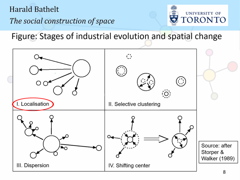 Bathelt教授结合他过去的研究成果,向同学们阐述了从经济地理学的角度理解产业集群发展模式的重要价值。Bathelt教授认为,集群是嵌入到随时间发展的特定生产环境中的,并且企业依赖其在区域内外的持续互动。他之后又从多个维度解读了产业经济集群及其发展演变的过程。