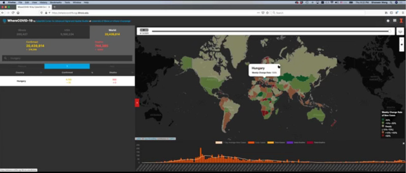 Shaowen Wang教授首先向同学们展示了由他参与的疫情数据监测可视化网站项目。该网站收集整理了从疫情爆发之初至今的所有疫情相关的时空数据,还可以根据需要在全球、国家、州等不同的空间尺度上进行可视化展示,生动形象地展现疫情的分布态势和变化情况。