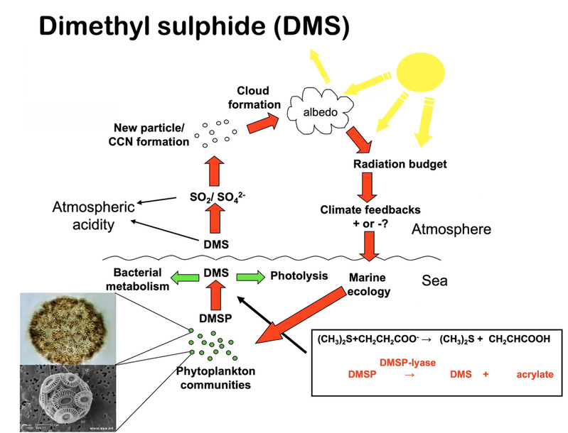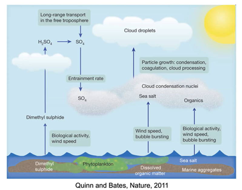 接下来,Liss教授介绍了CLAW假说。CLAW假说早在1987年就被提出,它认为,海洋中的生物质能够影响大气的物理性质。CLAW假说对于新粒子生成的解释是极其简化的,在实际大气中,新粒子生成过程会受到许多复杂的影响。但是CLAW假说具有非凡的理论价值。