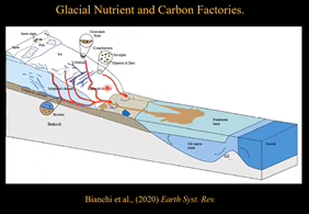 接下来,Bianchi教授向同学们重点介绍了冰川峡湾在碳储存中的重要地位。他介绍了冰川峡湾OC埋藏的特点,以及冰川消融使得新的三角洲平台出露,对于OC运输和埋藏过程的影响。最后,Bianchi教授提到了人类活动对于碳储存的影响。由于技术限制,我们对生物-地质关系的认知还十分局限,还需要更多的研究。