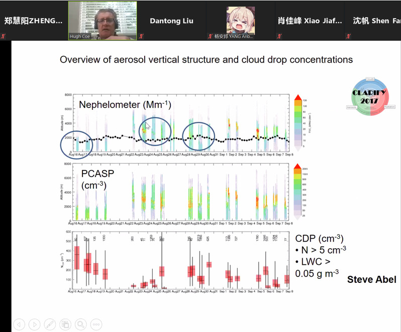 接下来,Coe教授介绍了气溶胶的组成、划分标准以及模态,并以简要的动画展示了气溶胶粒子影响气候系统的机制。他在2017年参与的项目通过飞机、卫星以及地面设备观测了9月-10月非洲的生物质燃烧过程,获得了数据修正模型,通过改变模型中云的含量与分布获得了一些结果,比如此过程中不同高度气溶胶分布以及组成。由于黑碳粒子(BC)有吸收作用,Coe教授还列举了其他研究展示其与气溶胶光学特性之间关系。