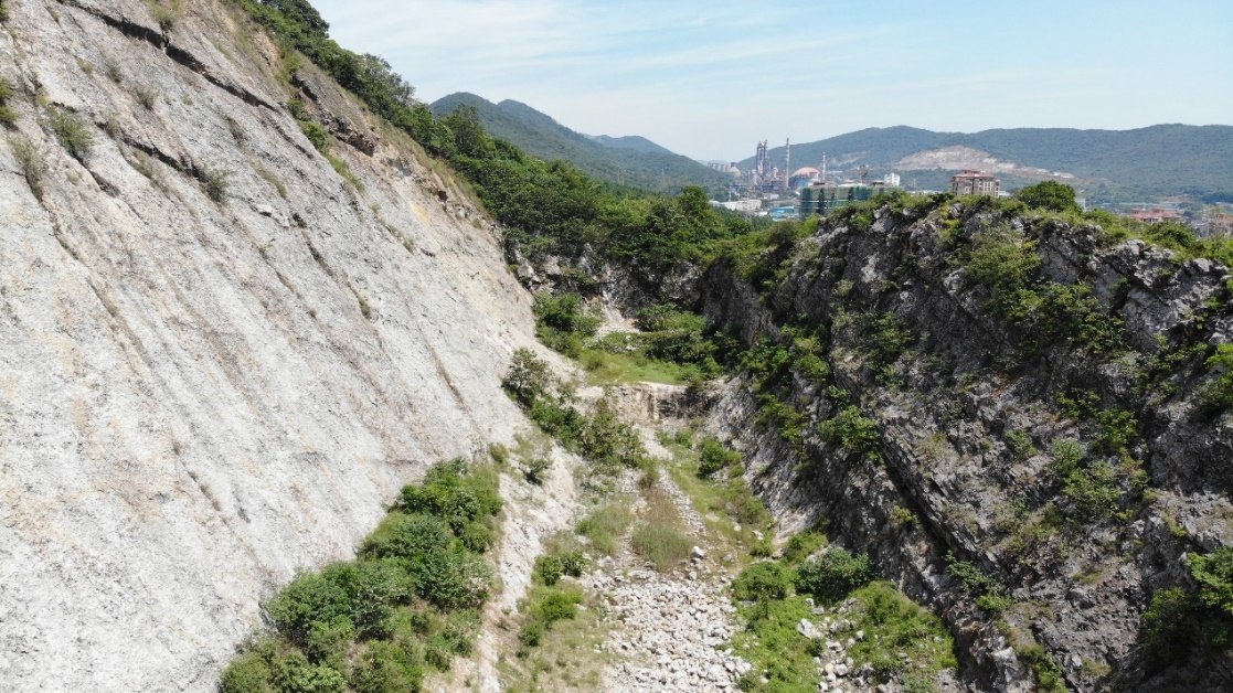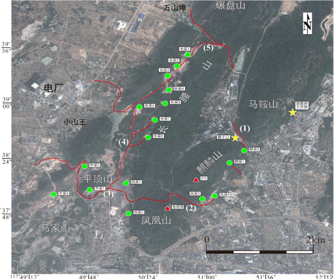 往年的调查通常持续几天,每天需要徒步好几公里,沿路测量岩层产状,记录大量数据并收集岩石标本,培养和锻炼团队合作和吃苦耐劳的精神。今年由于疫情,我们通过学长学姐们往年在野外采集的照片数据,以及巢湖汛情稳定后老师专门赴实习区拍摄的一些视频资料,结合Google earth和global mapper等软件工具,完成数据分析和制图。结合地形图,从Google earth上,我们划分如图五条考察路线,对沿途照片信息归纳总结,按标准格式整理野外记录本,再对当天观察到的地质现象进行报告。