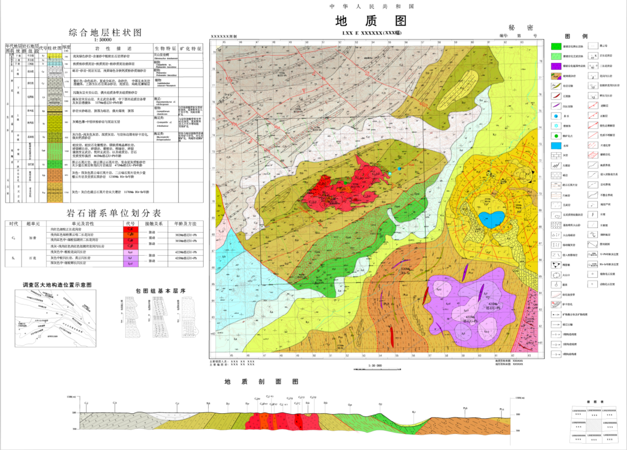 在最后的填图上色阶段,我们以地形图作为底图,运用统一的符号,色谱等将地表的地层、岩体、地质构造和矿产等地质要素,按规范投影在地形图上。