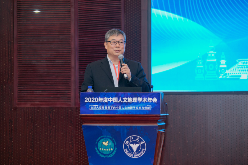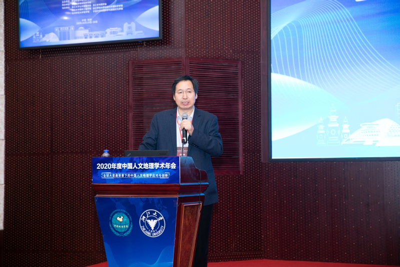 中国地理学会人文地理学专业委员会主任方创琳致辞。本次会议在各单位多次沟通、数次研判、精心组织下,克服了重重困难之后才得以召开的,他对本次年会的主办方、承办方、协办方以及出席大会的各位领导嘉宾表示衷心感谢。他强调,在百年未有之大变局下,要继续加强人文地理学和自然地理学的交叉研究,瞄准联合国可持续发展议程和国际前沿,面向国家重大需求,不断用新数据、新方法、新手段来创新人文与地学新的联动。