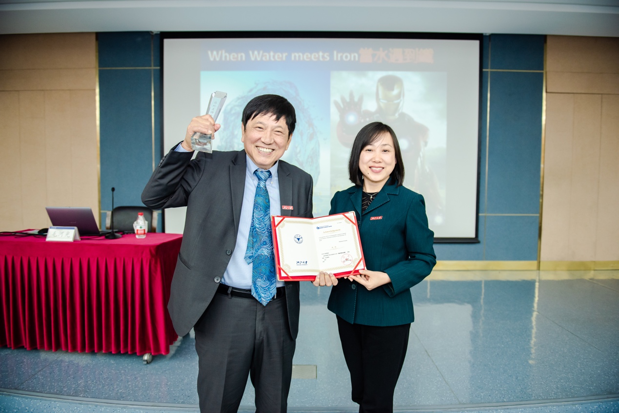 最后,国际合作与交流处处长李敏为毛河光博士颁发“海外名师大讲堂”致谢证书和奖杯。