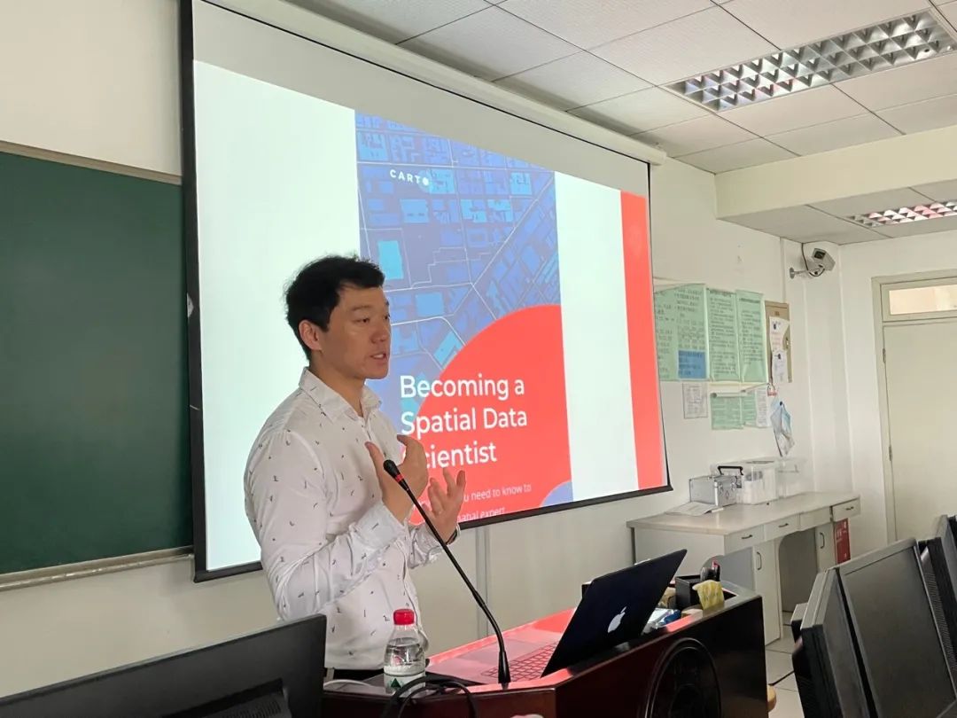 课程分为四个部分,第一部分是空间数据科学和时空大数据分析方法,美国威斯康辛大学麦迪逊分校助理教授高松博士应邀讲学,为同学们开展基于社交媒体数据的时空分析研究和实践提供了参考。第二部分是国际重大灾害数据与灾损信息服务GIS平台技术框架讲解,包括Git、Vue、Spring Boot、Mybatis等前后端开发技术。第三部分是海陆相互作用虚拟仿真平台,认识海洋实测数据、遥感反演产品、海底地形建模、基础地理信息等多源空间数据在三维球平台上实现的信息集成与可视化分析,加深对于时空场、时空序列分析与时空模型计算等知识的理解。第四部分是同学们分组进行国际重大灾害数据与灾损信息服务GIS平台的设计与研发。