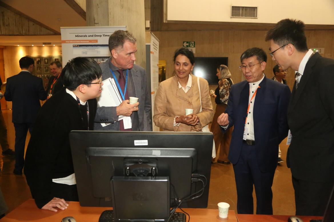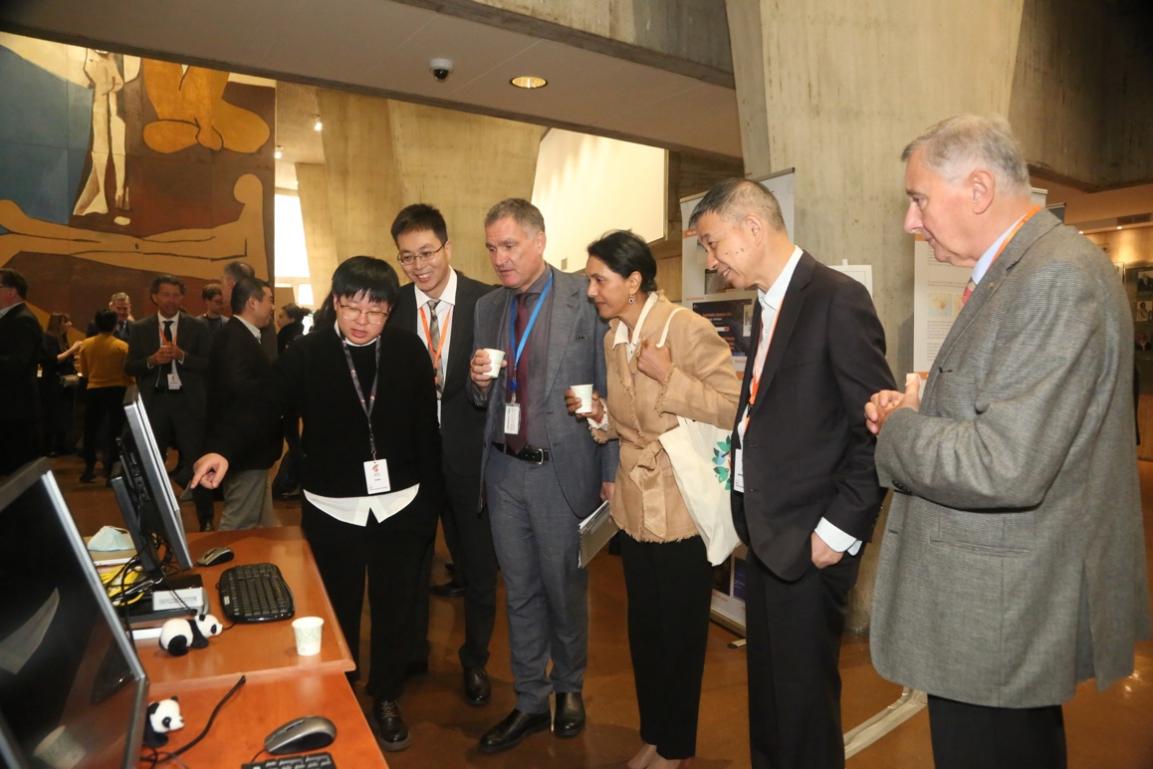 8 浙大杜震洪教授团队汪愿愿老师(左2)和胡林舒老师(左1)向UNESCO自然科学助理总干事Shamila Nair-Bedouelle博士介绍Deep-time.org