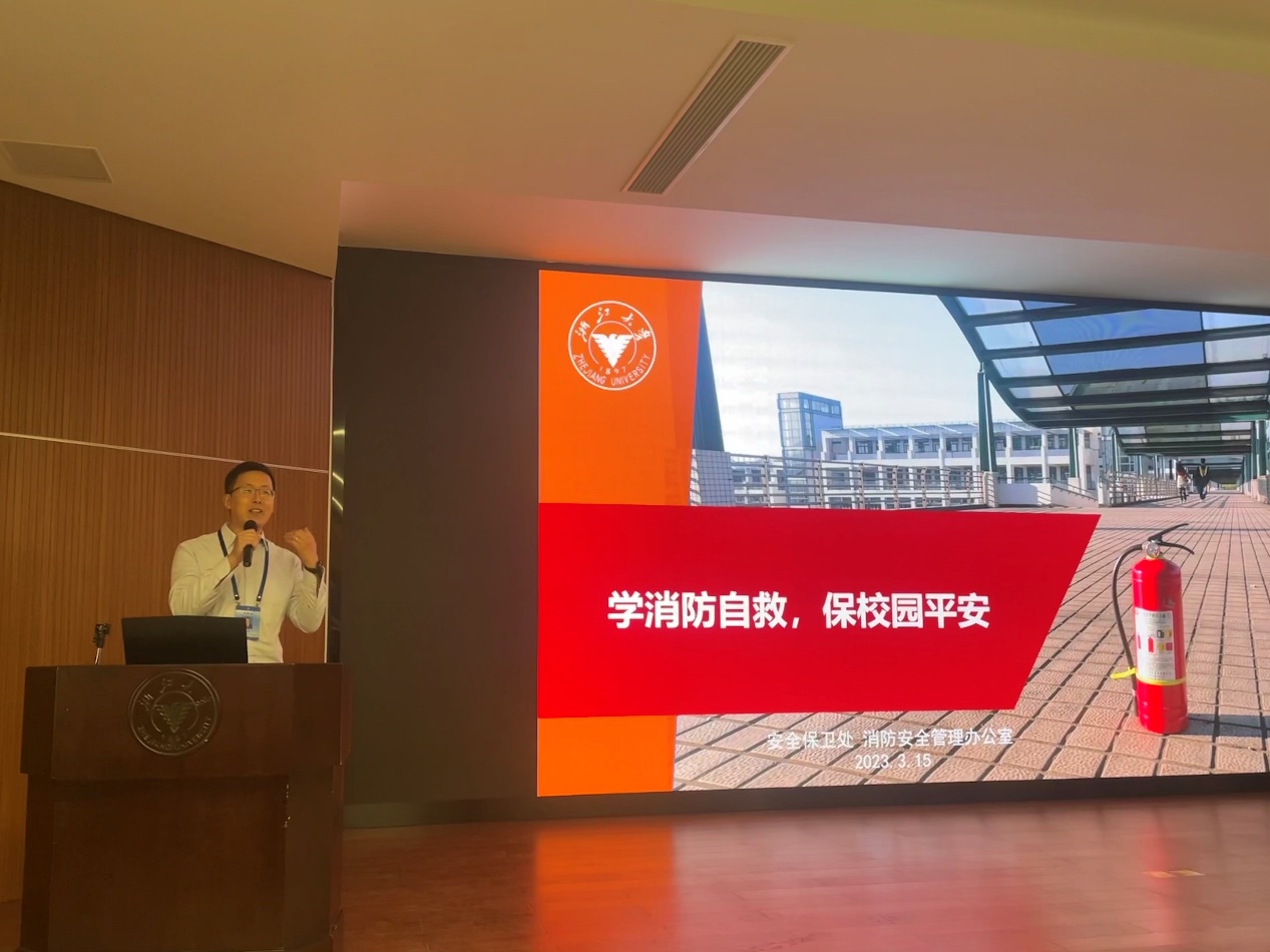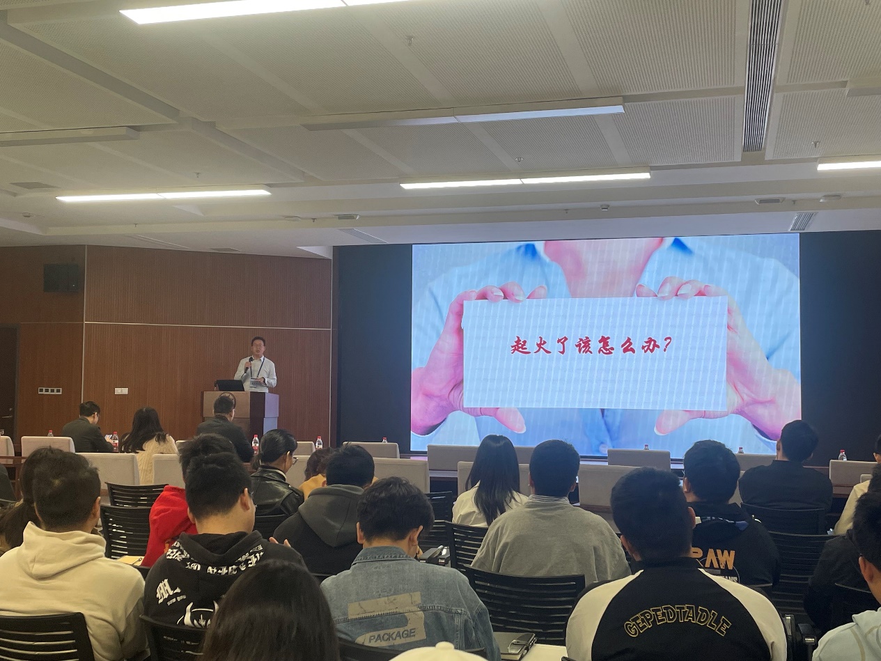 演习开始前,学校安全保卫处消防安全管理办公室夏平副主任为学院师生做题为“学消防自救,保校园平安”的安全讲座报告,他首先抛出“起火了该怎么办”的问题与在场师生互动,随后逐一讲解了遇到火灾时的正确应对措施:需在火势可控的情况下先尝试“自行扑灭”,发现火情无法自行扑灭时要“及时求救”,最后“逃生自救”时需保持理智,保障自身安全后视情况展开互救。学习内容包含了认识各种常见消防设施与器材、灭火器的使用方法、逃生自救的正确步骤以及各种反面事例的经验教训。最后夏平老师强调,预防在平时,要做到“三懂、四会、五不要”,特别是实验室要始终保持安全通道畅通,“给自己留后路”。