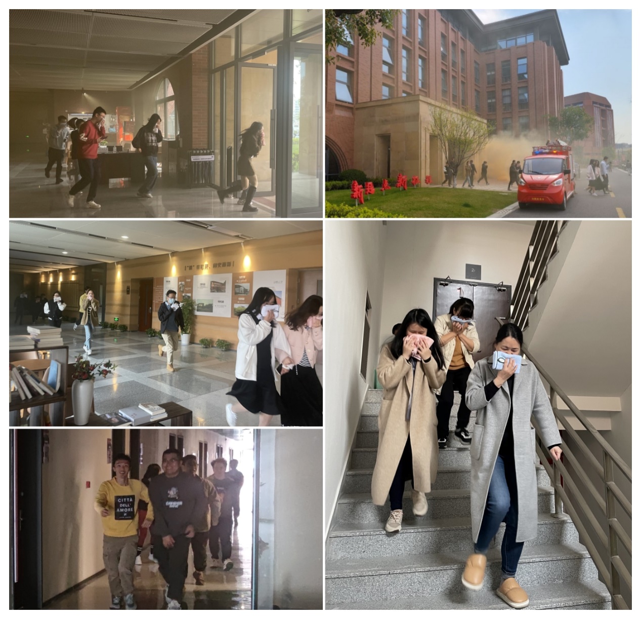 安全培训结束后,学院大楼内声光警报响起,楼外浓烟滚滚,实战演习正式开始。楼内师生见势立即用湿毛巾捂住口鼻,俯身奔跑,在引导人员指引下,从消防安全逃生通道快速且有序地撤离。