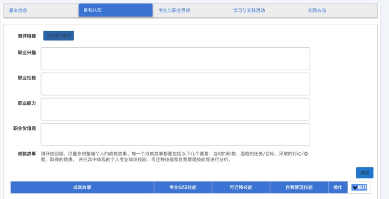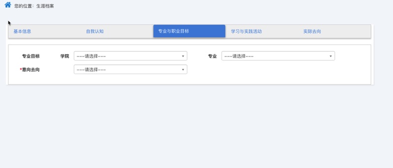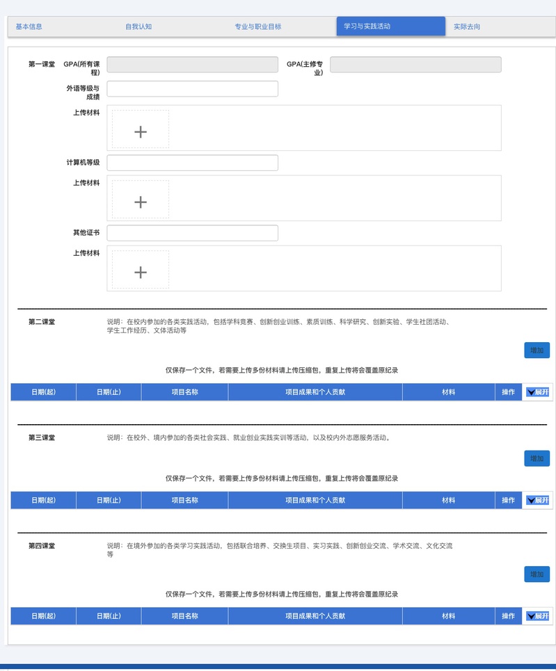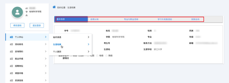 打开https://www.career.zju.edu.cn/(统一认证登录)->个人中心->生涯档案->依次完成五个模块的填写