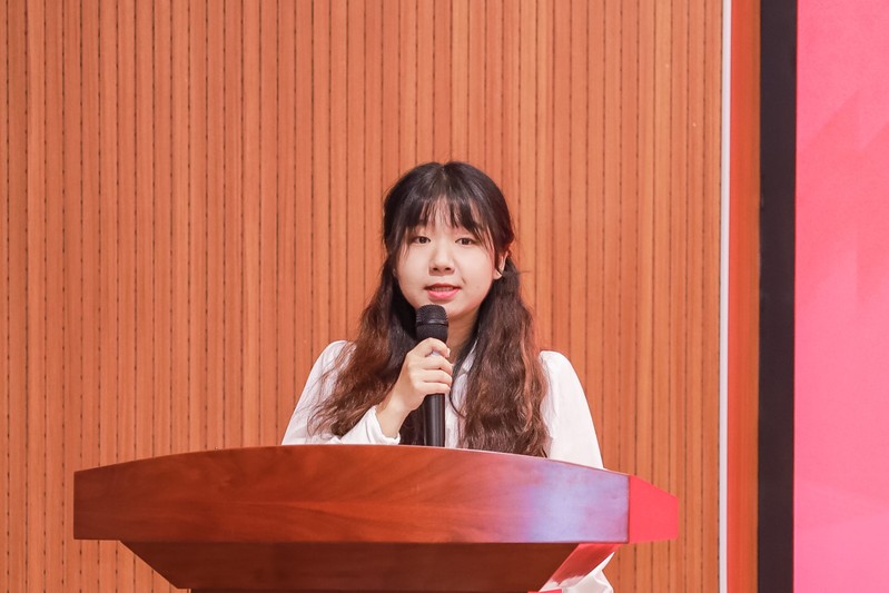 毕业研究生代表、资源勘查与地球物理专业硕士生陶柳蓉讲述了自己研究生阶段开展科研的心路历程。她呼吁同学们坚守地学人的纯粹与浪漫,做敢想敢为、善作善成的中国式现代化建设者。