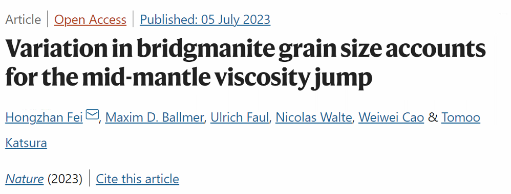 7月5日,该项工作以“Variation in bridgmanite grain size accounts for the mid-mantle viscosity jump”为题在线发表在《Nature》杂志,为地幔流变学和地球演化过程研究提供了关键依据。
