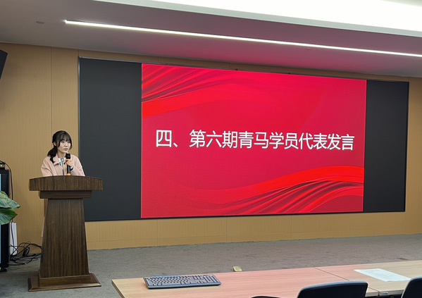 第六期学员熊佳忆同学进行发言,她表示接过第五期青马班学员手中的接力棒,要将这份荣誉与责任传递下去,在今后的学习中要励志求真,努力成为优秀的青马人。肩负起历史使命,坚定自己的理想信念,努力成为能担起民族重任的时代青年。