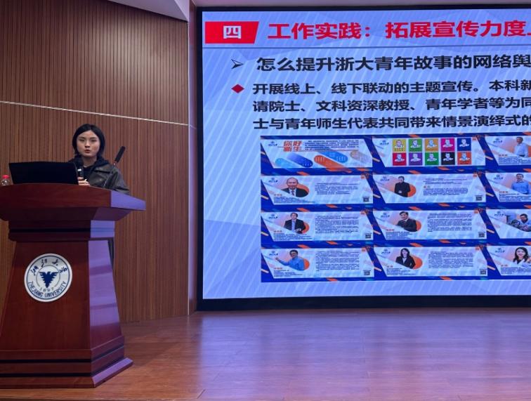 文学院学生会主席团成员丁思琼同学进行了学生工作的经验分享。丁同学强调了学生组织成员之间互勉协作、院系之间交流合作的重要性,并分享了文学院学生会内部建设的成功经验。丁同学还介绍了中文演讲竞赛、思政微课大赛、人文摄影展等文学院品牌活动,分享了将品牌活动与思政育人、学科资源结合的思路,给在场的同学们带来思考与启发。