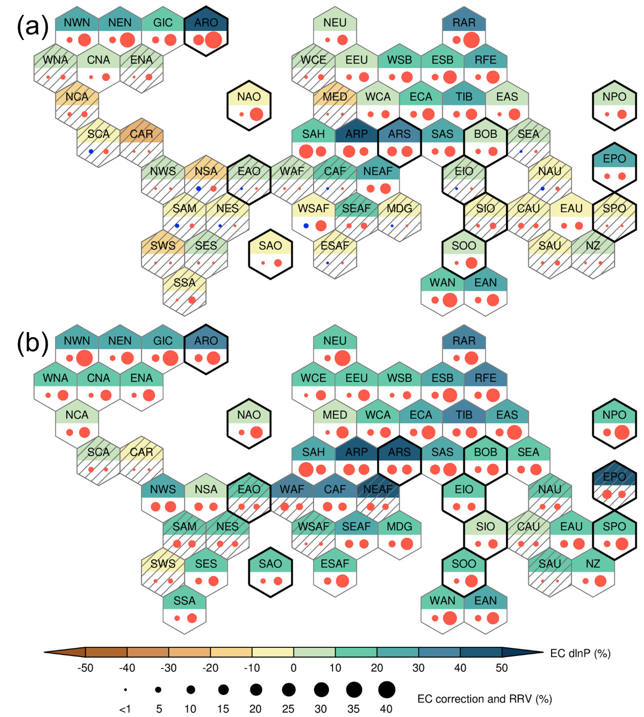 1 经过约束修正,高排放情景下本世纪末全球各区域(a)平均降水和(b)极端降水的气候预估。各区域分别用六边形表示,六边形上方为区域名称缩写,填色为降水的相对变化;下方左右圆点分别代表约束对多模式集合平均值和模式间方差的减小。
