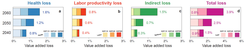 该研究系统性地精准量化了在不同共享社会经济发展路径(Shared Socioeconomic Pathways, SSP)下,到本世纪中叶因气候变暖造成的生命健康损失、劳动生产率损失和价值链中断损失。该研究创新性的基于气候带特征对全球热浪的健康风险进行评估和验证,通过深入剖析气候变化对全球价值链的影响机理,充分识别并重点分析了脆弱国家和关键细分产业的气候风险。结果显示,由于极端热浪引起的全球每年GDP损失将从2030年代的0.3%-1.7%非线性增长到2060年代的0.6%-4.6%。在SSP585情景中,随着全球暖化的加剧,健康损失和由价值链中断引起的间接损失将占据主导作用。 相对而言,中小型发展中国家承受的损失更加严峻。同时,价值链的中断带来了更广泛的影响,对包括中国和美国在内的制造业大国造成了巨大冲击。