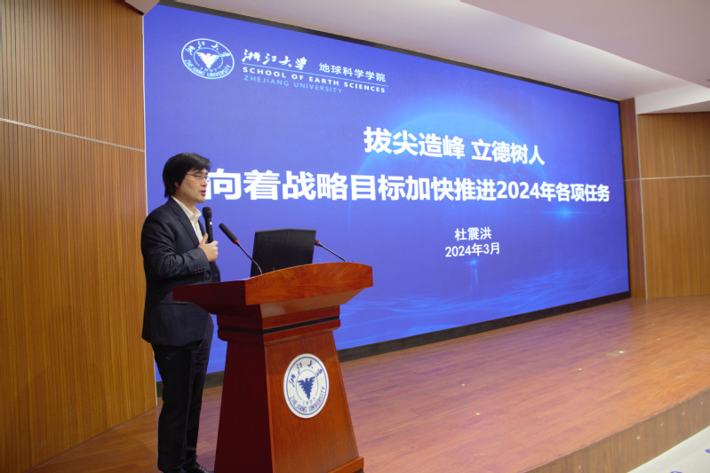 常务副院长杜震洪作题为《拔尖造峰 立德树人 向着战略目标加快推进2024年各项任务》的报告。过去的一年,学院紧紧围绕“打造具有国际影响力的‘大数据与地球系统’创新研究高地”和“打造具有浙大地学特色红专并进的创新人才培养体系”的战略目标,凝心聚力,强家底、推项目、重人才,数据驱动的地球科学研究范式变革初具成效,并在人才引育、立德树人、科研产出等方面做出了亮点,是团结奋进努力的一年。同时,他结合迈向世界优秀学科建设的要求,部署2024年重点工作。学院要持续推进国家级平台建设,谋划重大项目,激励重大性、原创性、标志性成果产出,壮大学科领军人才队伍和优秀青年人才队伍,深化体制机制改革,“乘众人之智、用众人之力”向实现战略目标继续奋斗。