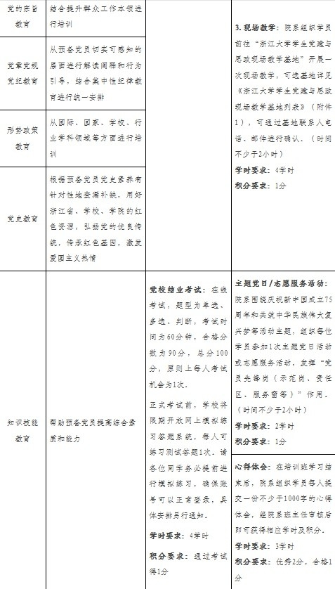 1.学员要正确认识到党校培训的重要性,以认真的态度、饱满的热情参加各项培训内容。培训采用积分制方式进行考核,每个教学环节给以相应的积分。本期培训总积分未达到10分或结业考试成绩未合格的,不予结业,未获结业证书的研究生预备党员不能转正。