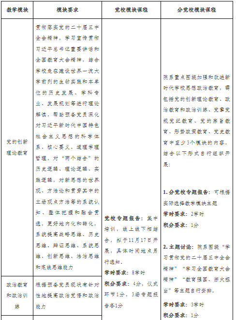 1.培训班教学活动采用校院两级结合的方式进行,学校党校统一组织专题报告、专题教学、结业考试等环节,院级分党校负责组织专题报告、主题讨论、现场教学、主题党日/志愿服务活动、心得体会等环节。除以上教学内容,院级分党校还可自行设计其他教学模块和要求。