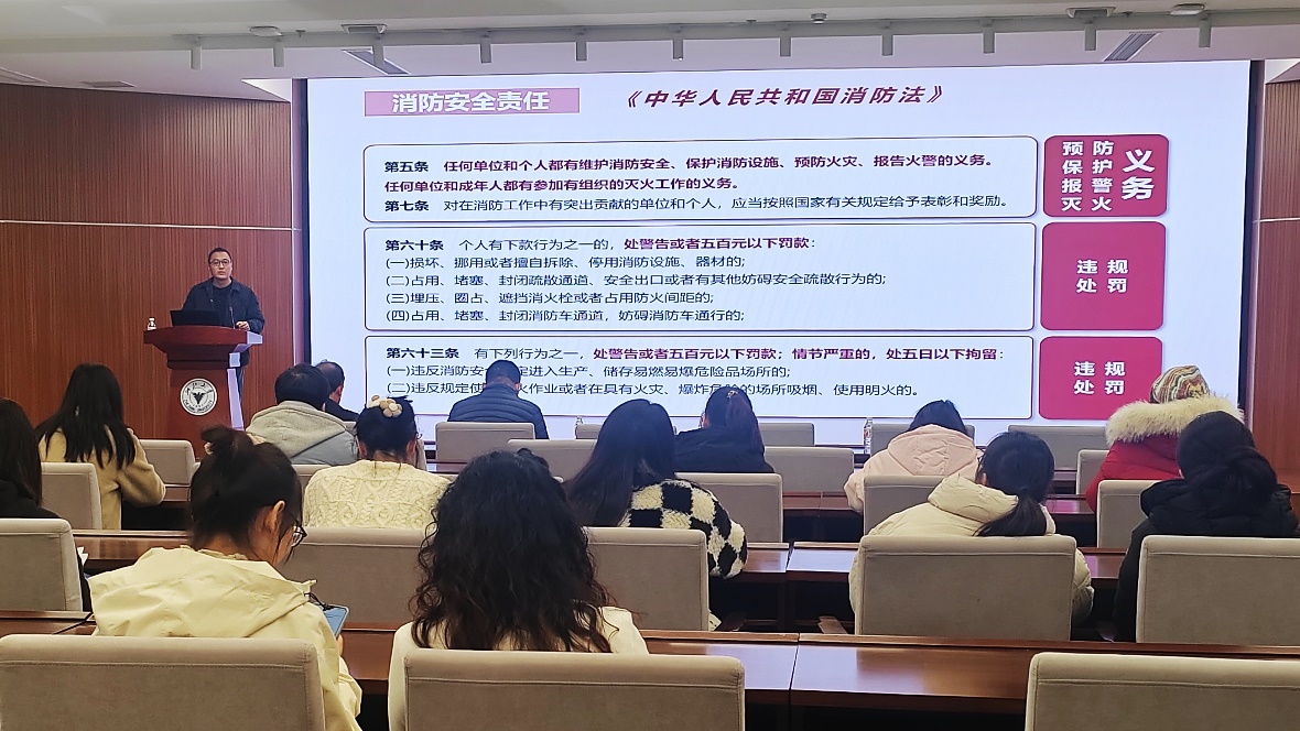 演练开始前,学校安全保卫处消防安全管理办公室李辉副主任为学院师生作了题为“筑牢消防意识,守紧安全底线”的消防安全知识讲座。他首先提出了两个问题:消防安全与我有关系吗?如何应对隐患和火情?随后围绕这两个问题,他强调了消防安全责任,介绍了八种消防安全隐患,对如何应对消防隐患与火情,提出了“会预防”、“全消灭”、“会逃生”的三个要求。