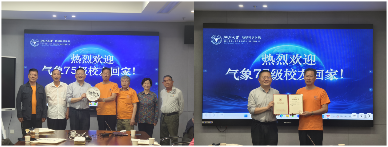 为表达对母院的感恩之情,气象75级校友精心准备并向学院捐赠了寓意深远的“求是创新 继往开来”八马奔腾瓷盘纪念品。曹龙教授代表学院接受了这份承载着深厚情谊的珍贵礼物,并向气象75级校友颁发捐赠证书。