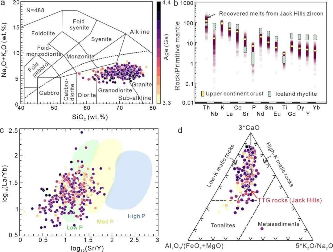 该研究首次系统性地重建了冥古宙陆壳的“岩石”组成,并探讨了其形成机制。通过机器学习方法,揭示了Jack Hills碎屑锆石所代表母岩浆的地球化学特征,恢复了多种传统方法难以准确定量的主量和微量元素组成信息(如SiO2, Na2O, K2O, Al2O3,Sr/Y比值等)。结果显示,冥古宙大陆地壳主要由低至中压的TTG岩石和富钾花岗岩组成。这些岩石主要源于汇聚增厚环境下低钾和高钾镁铁质原始地壳的部分熔融。该研究不仅填补了冥古宙大陆地壳“岩石记录”的空白,也为早期地球动力学演化提供了重要约束。